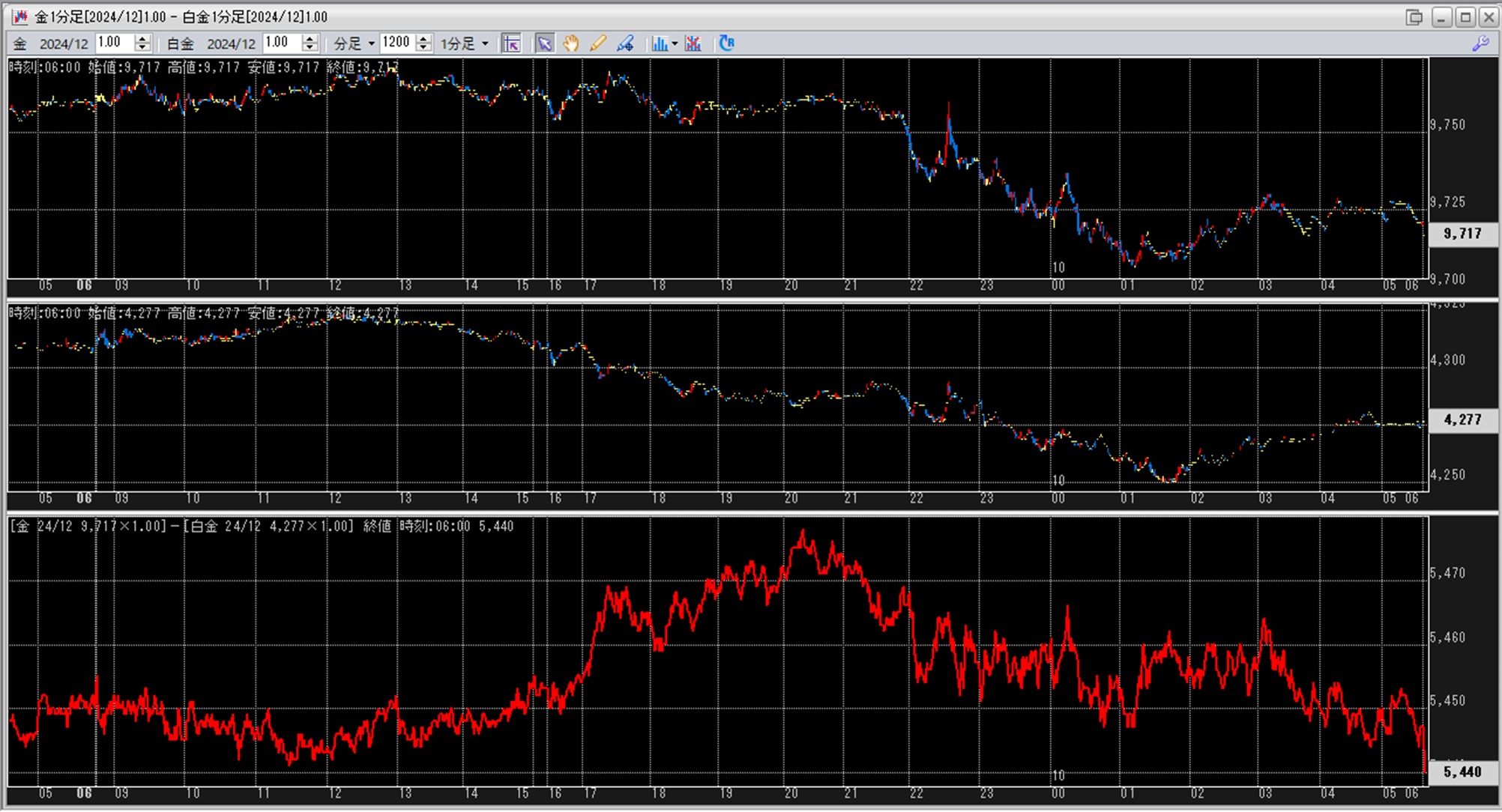 下:金白金鞘(金白金の価格差 = 金1グラムの価格 - 白金1グラムの価格)