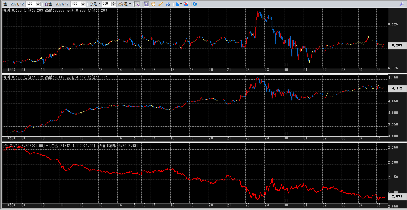 下記に2021年2月10日8:45~2月11日5:30 金白金鞘値動きのチャートを張り付けています。