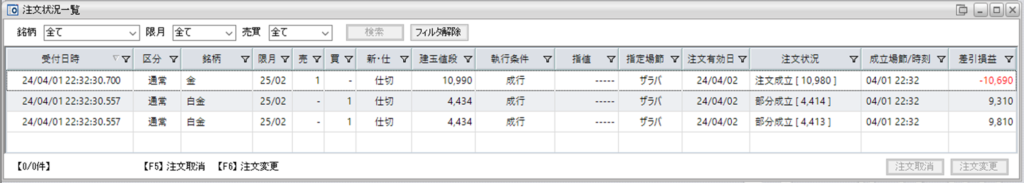 ですが、鞘拡大していくかもと思い、金買い1枚-白金売り2枚を1組を建て、