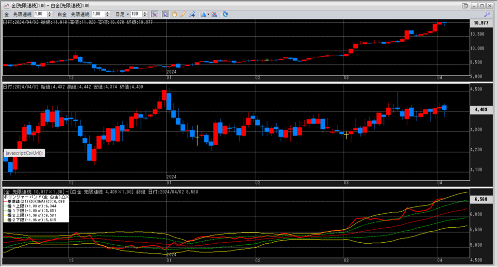 金白金の鞘をボリンジャーバンドで見ていきます。