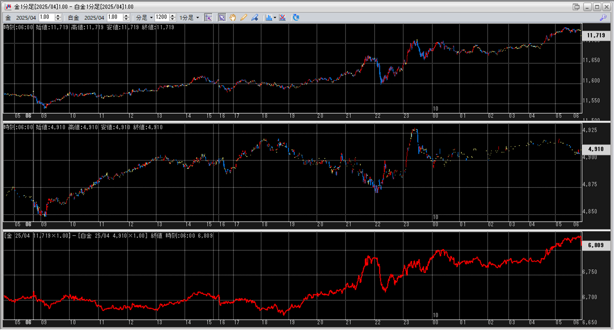 下:金白金鞘(金白金の価格差 = 金1グラムの価格 - 白金1グラムの価格)