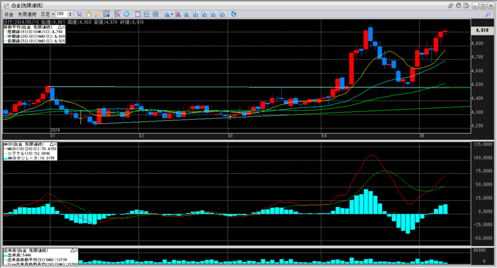 白金のチャートを見ると、4,100円から4,200円を下値とし、