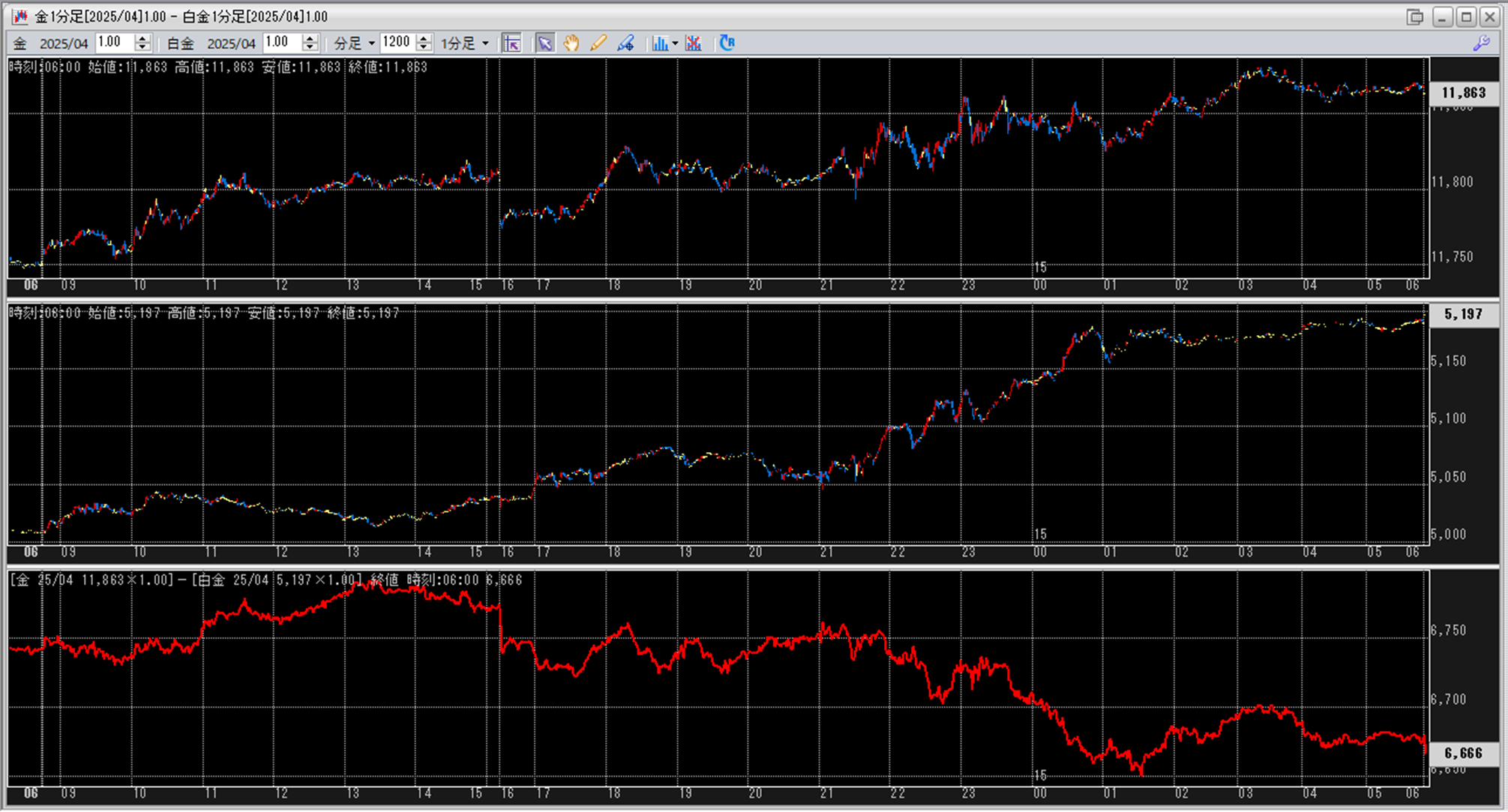 下:金白金鞘(金白金の価格差 = 金1グラムの価格 - 白金1グラムの価格)