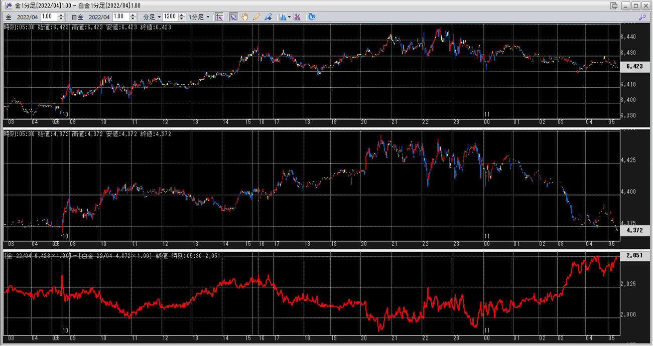 2021年5月10日8:45~5月11日5:30 金白金鞘値動きのチャートを張り付けています。
