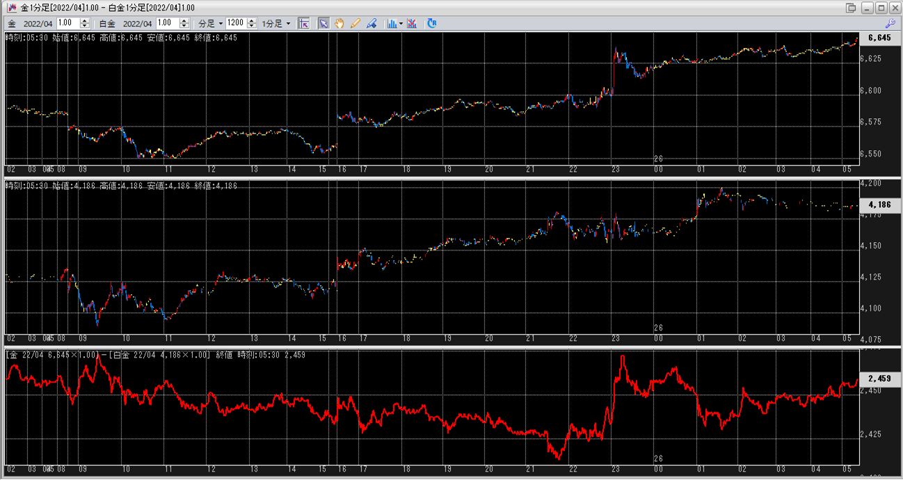 鞘拡大の仕掛けである金買い-白金売りを増やせる機会を待ちたいと思います。