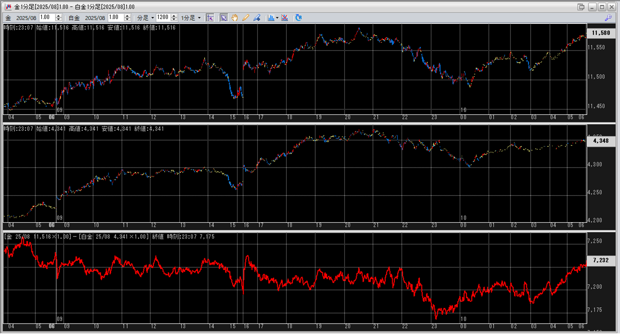 下:金白金鞘(金白金の価格差 = 金1グラムの価格 - 白金1グラムの価格)