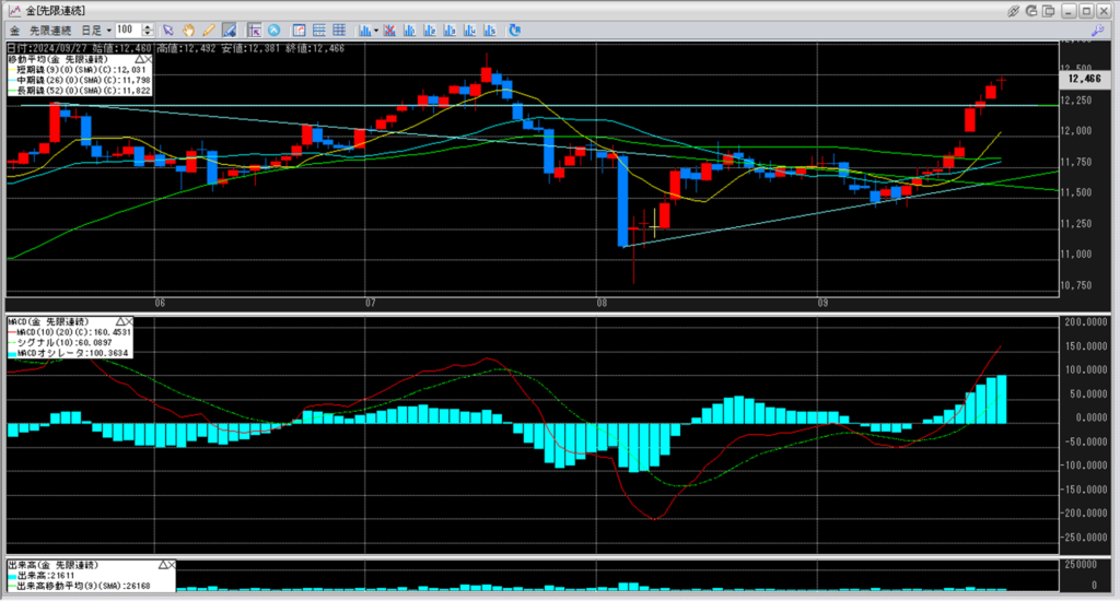 金価格の高騰が続き、勢いよく短期線が上昇し続けています。