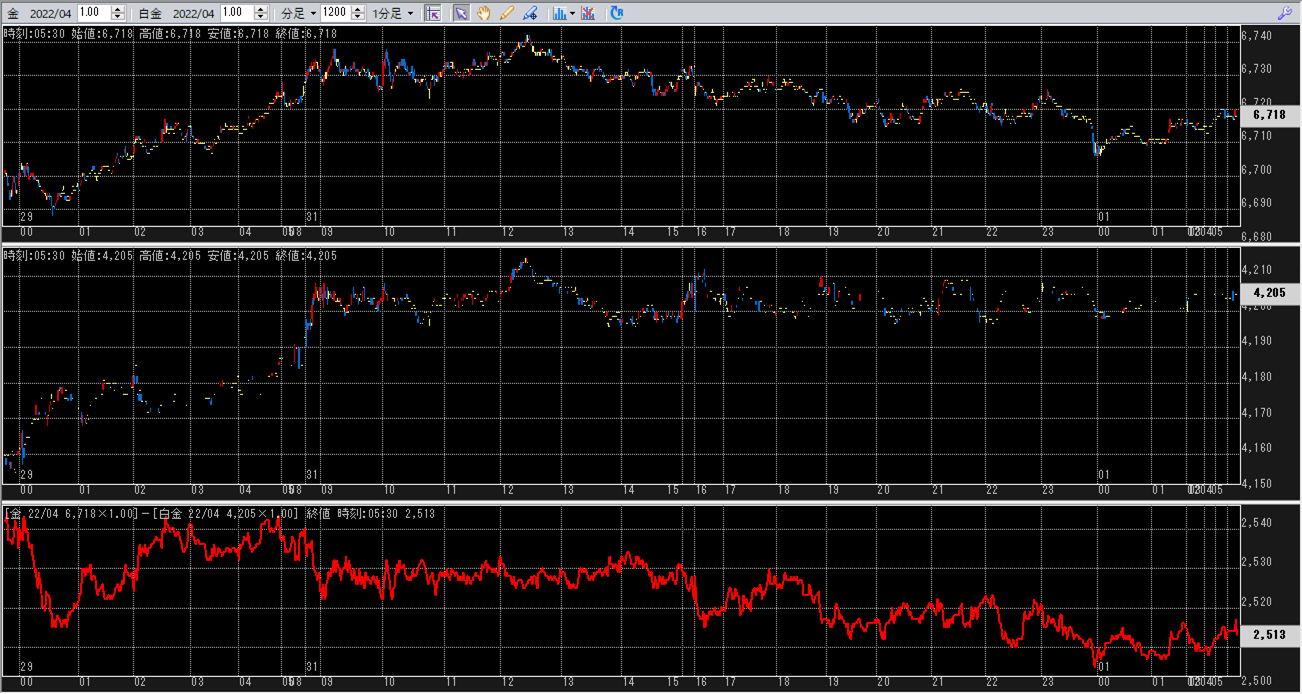 下:金白金鞘(金白金の価格差 = 金1グラムの価格 - 白金1グラムの価格)
