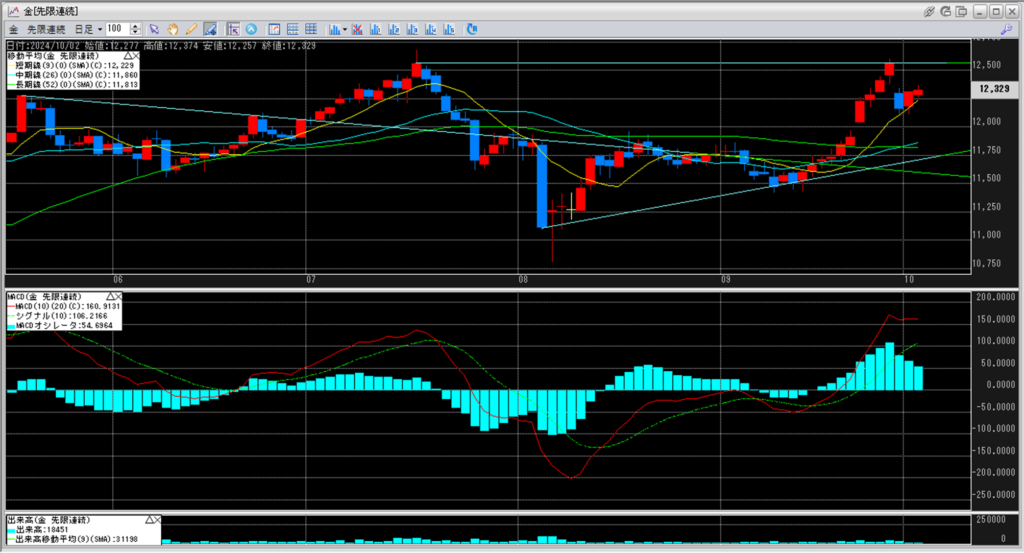 途中、12,000円超えを維持し、下落トレンドを超え、金価格は上がってきました。