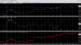 移動平均は、中期線は上向き、短期線と長期線は下向きになっています。