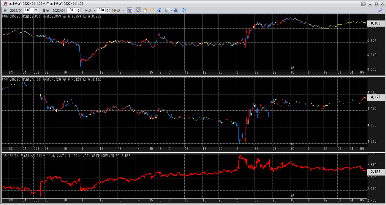 2021年6月4日8:45~6月5日5:30 金白金鞘値動きのチャートを張り付けています。