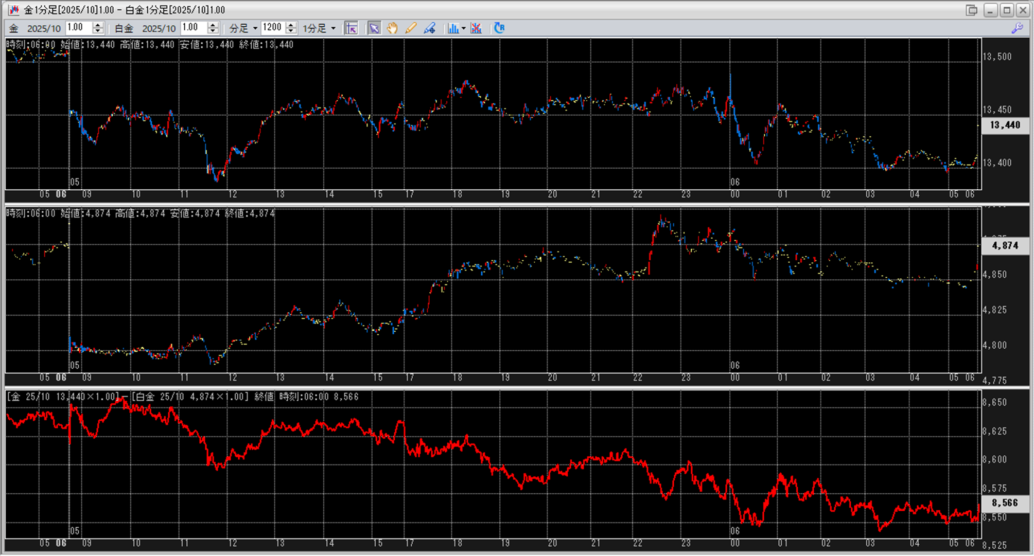 下:金白金鞘(金白金の価格差 = 金1グラムの価格 - 白金1グラムの価格)