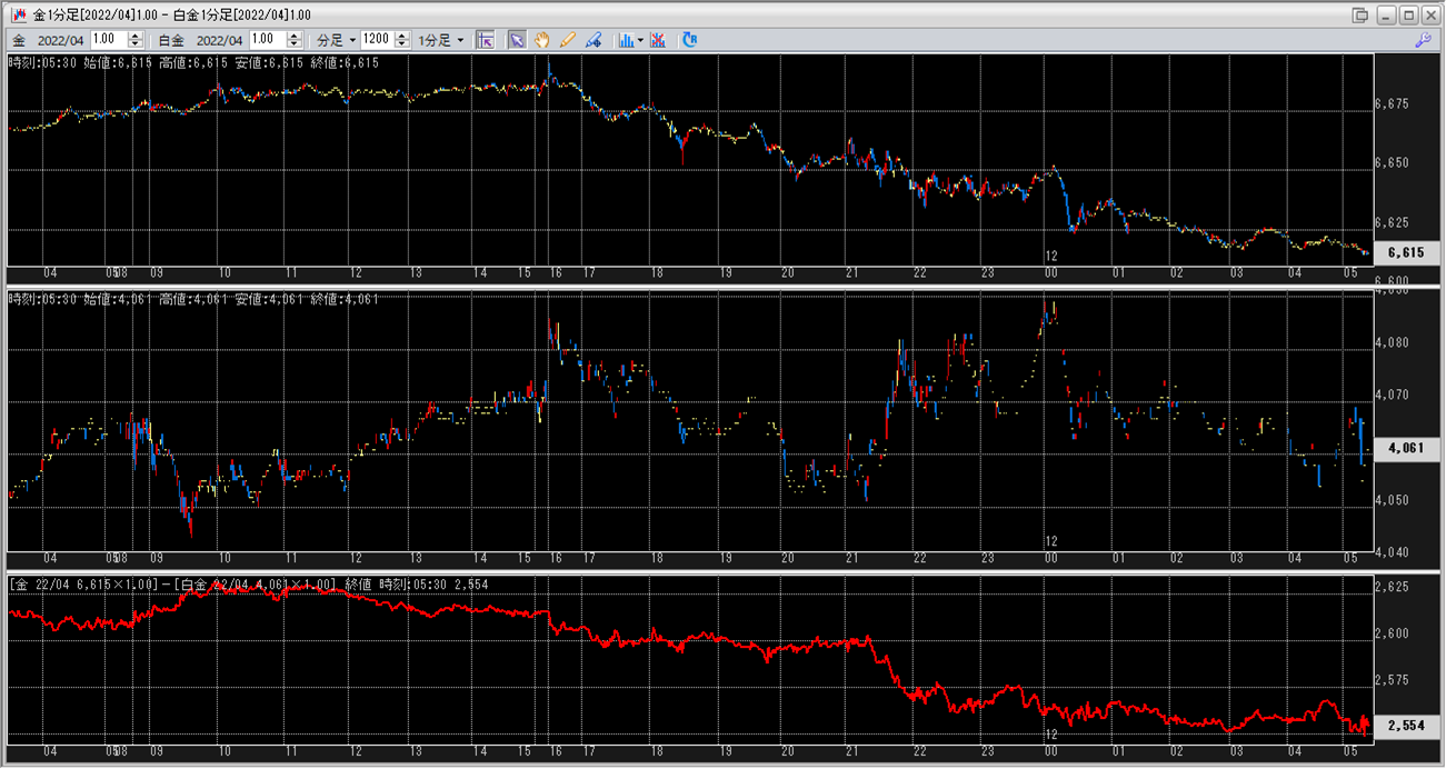 月曜日の値動き次第ですが、鞘拡大の仕掛け金買い1枚-白金売り2枚を1組ずつ、