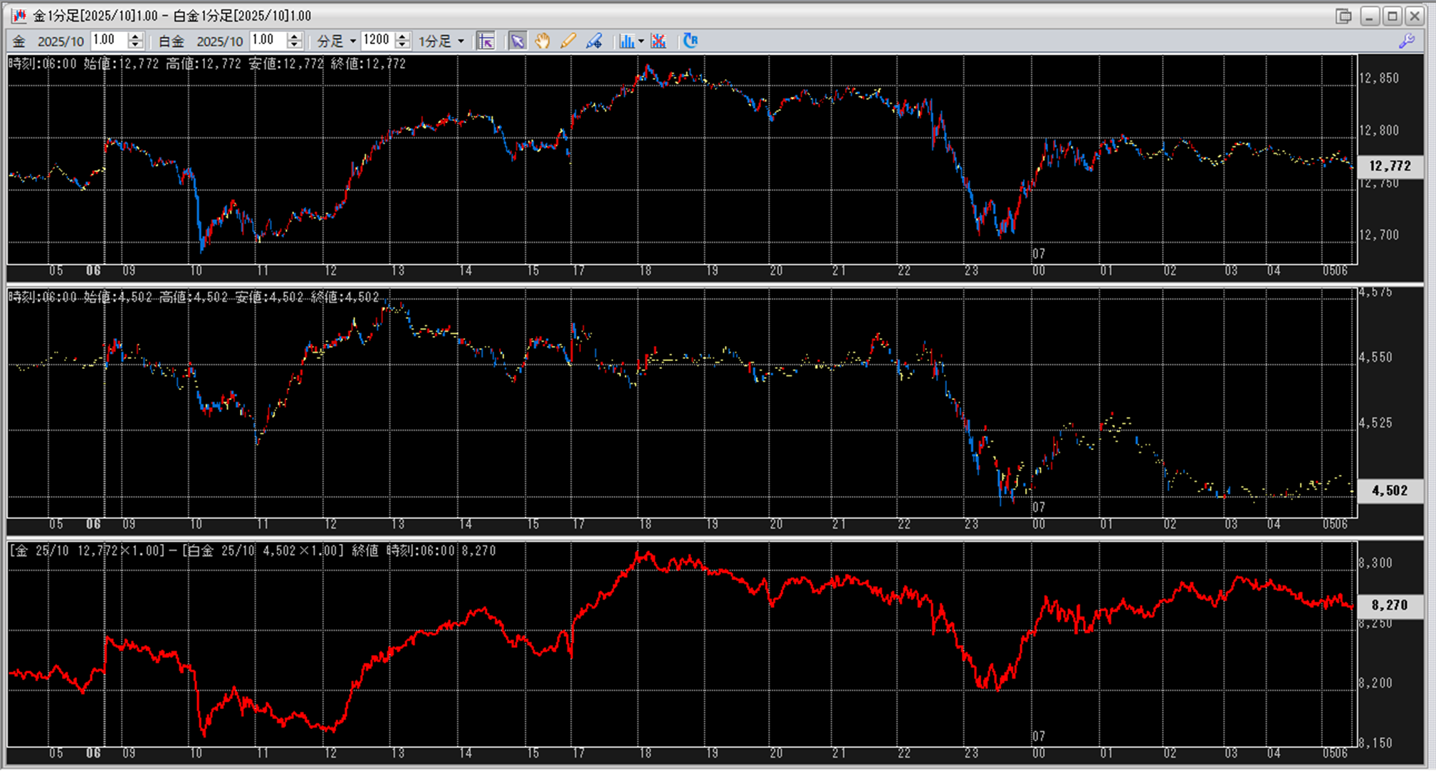 下:金白金鞘(金白金の価格差 = 金1グラムの価格 - 白金1グラムの価格)