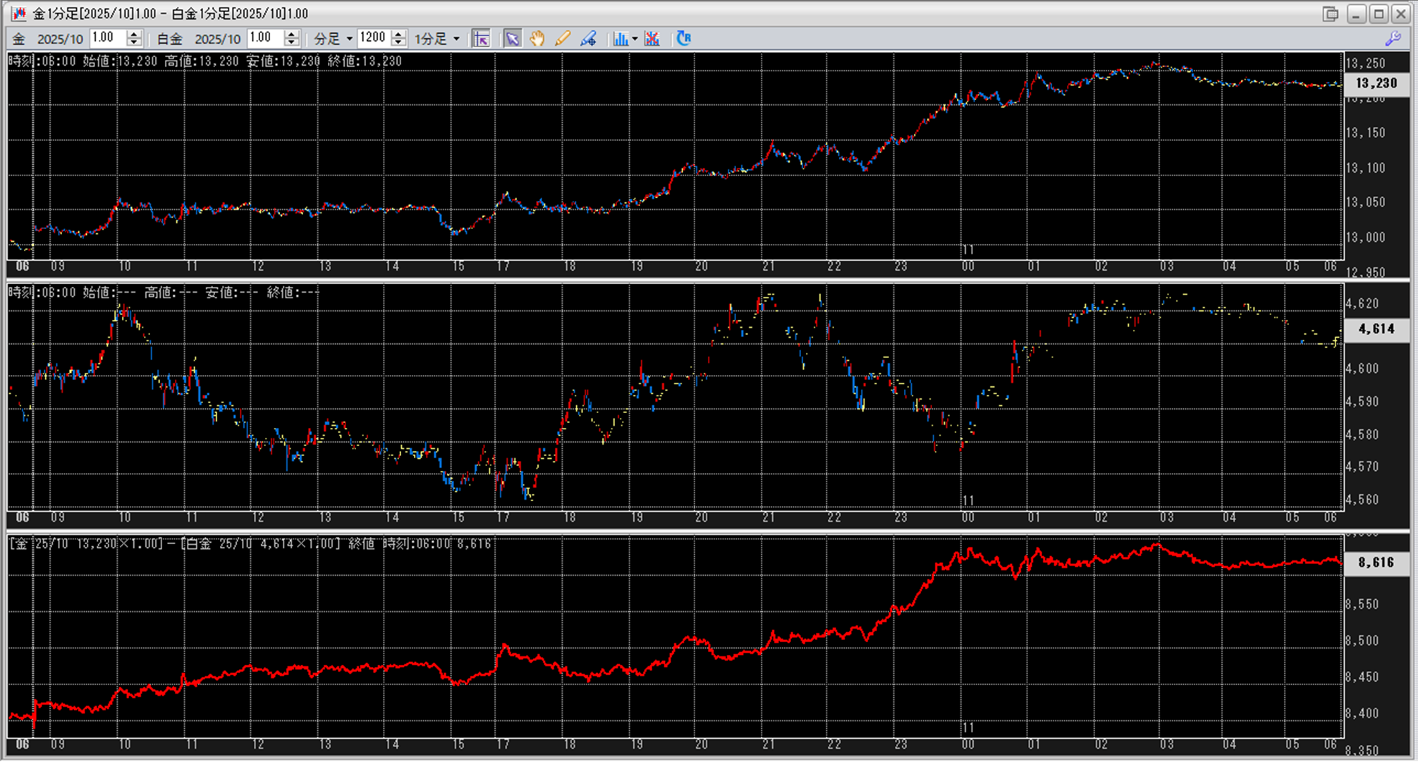 下:金白金鞘(金白金の価格差 = 金1グラムの価格 - 白金1グラムの価格)