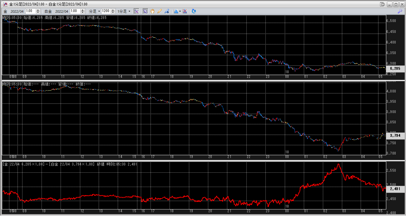 下:金白金鞘(金白金の価格差 = 金1グラムの価格 - 白金1グラムの価格)