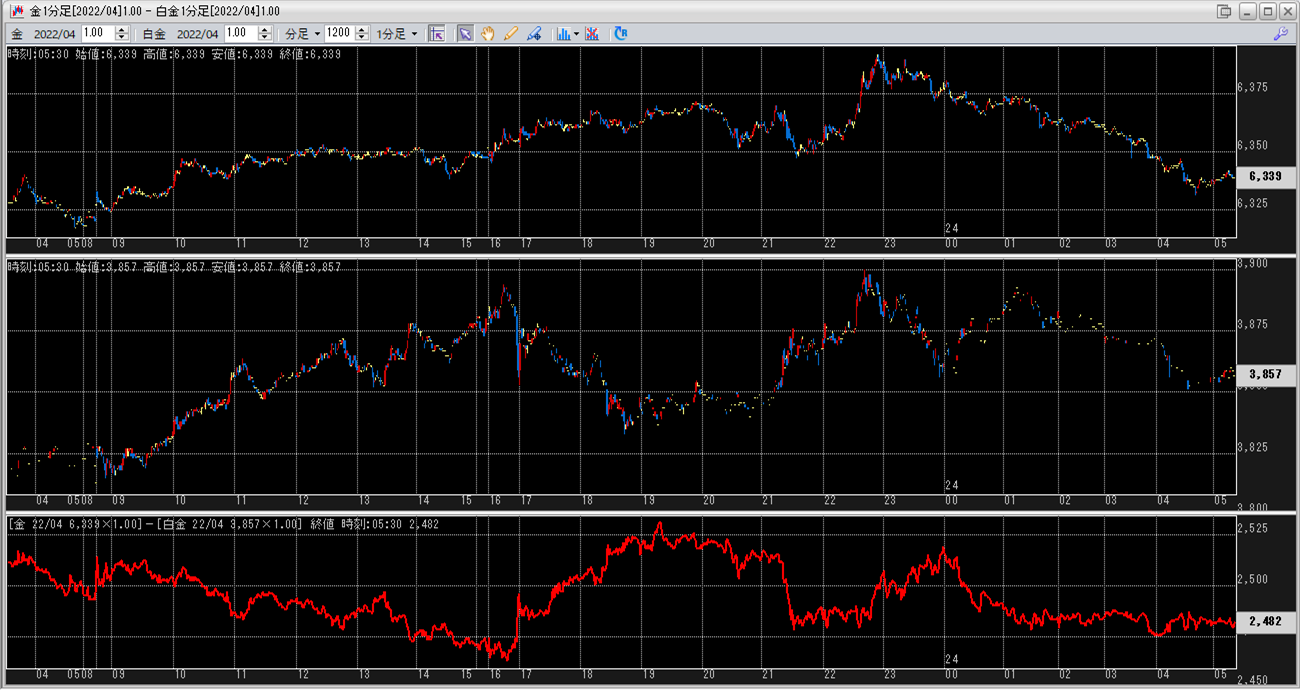 下:金白金鞘(金白金の価格差 = 金1グラムの価格 - 白金1グラムの価格)