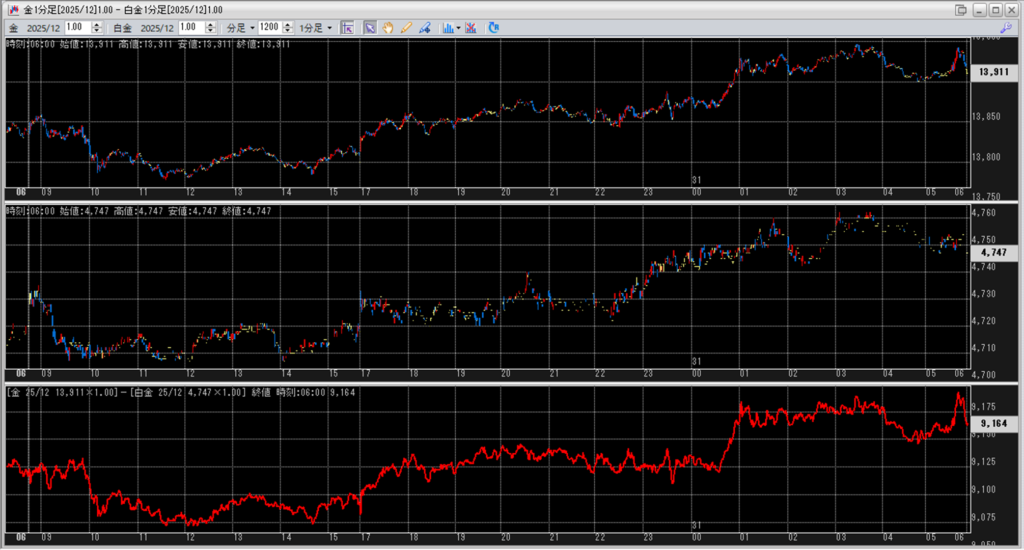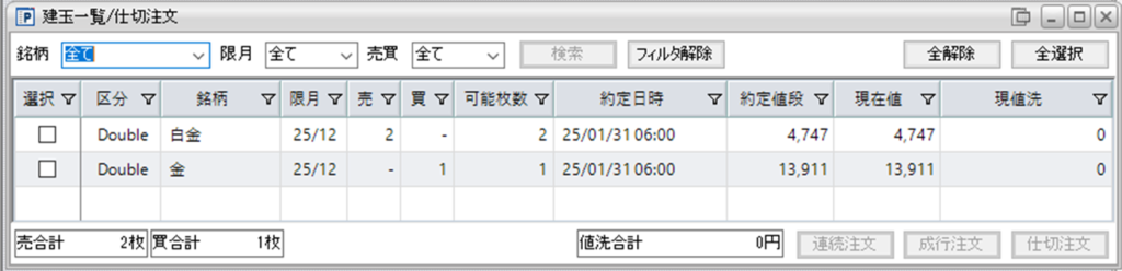 金価格が強いと考え、鞘拡大の仕掛け金買い1枚-白金売り2枚を仕掛けました。