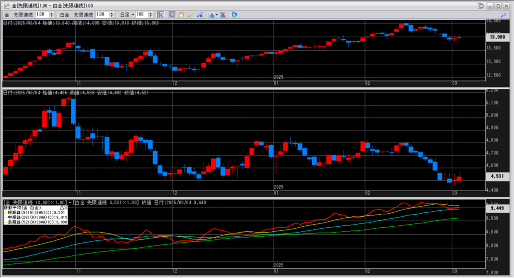 下記に金白金鞘の移動平均線のチャートを貼り付けています。