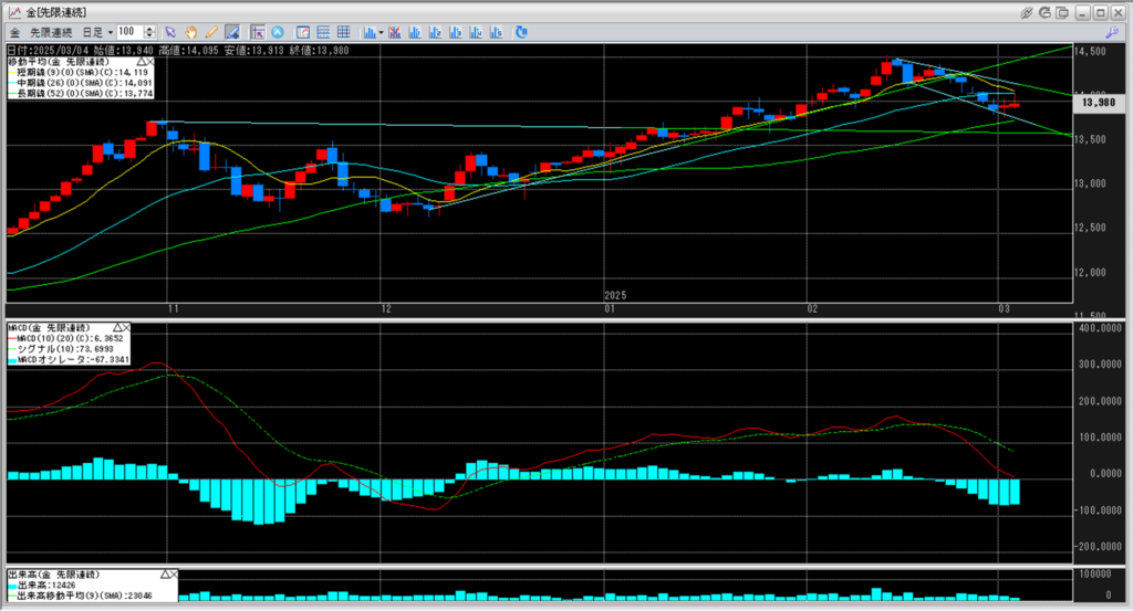 移動平均線の真ん中に位置している中期線14,091円を割り込んで、