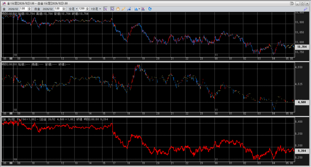 下:金白金鞘(金白金の価格差 = 金1グラムの価格 - 白金1グラムの価格)