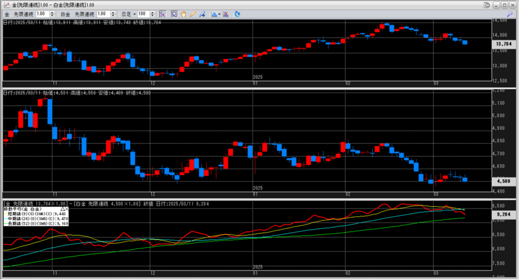下記に金白金鞘の移動平均線のチャートを貼り付けています。