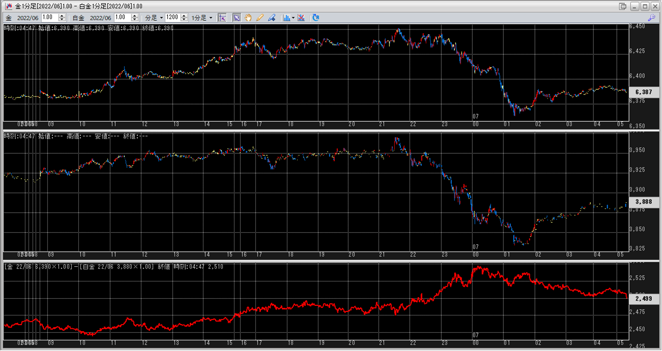 2021年7月6日8:45~7月7日5:30 金白金鞘値動きのチャートを張り付けています。