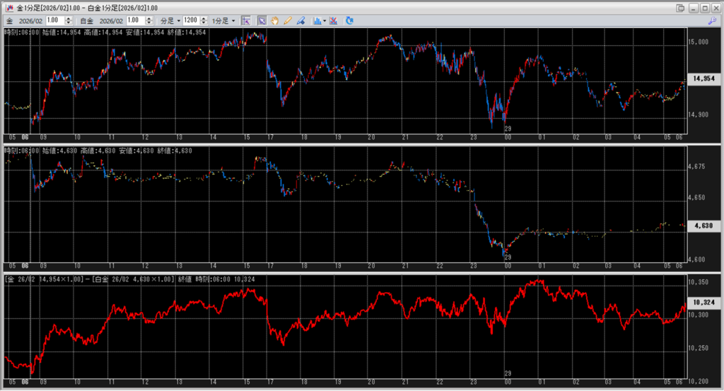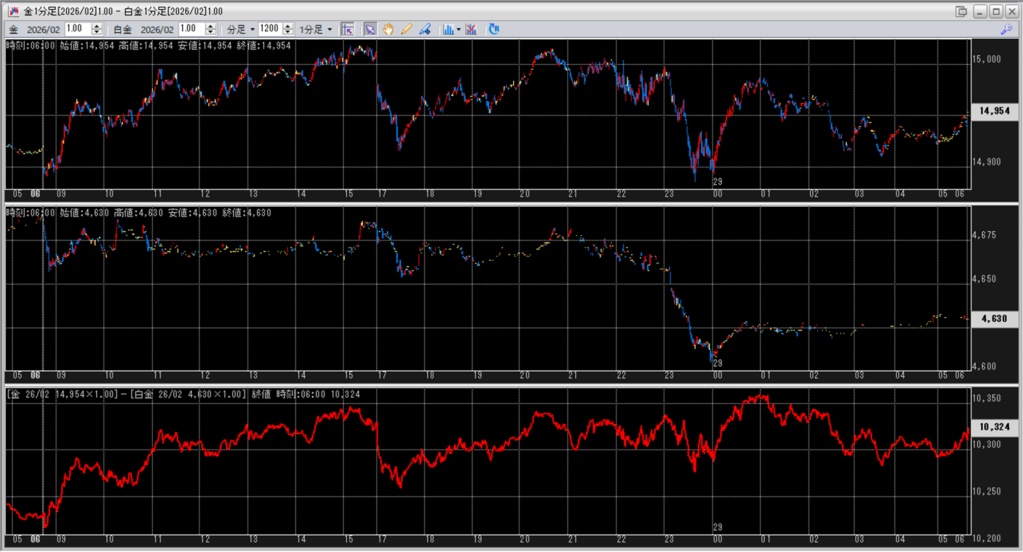 下:金白金鞘(金白金の価格差 = 金1グラムの価格 - 白金1グラムの価格)