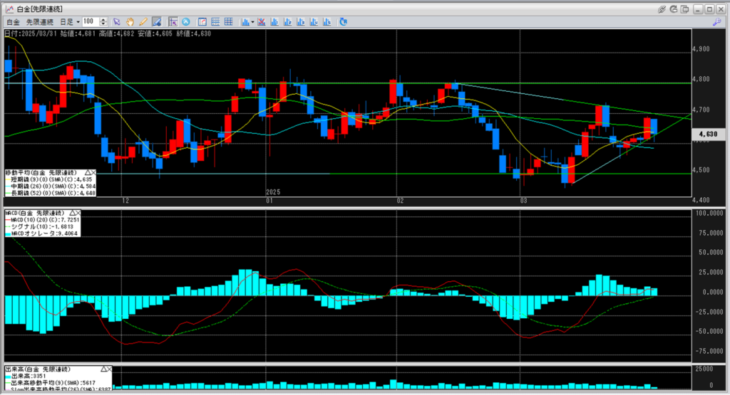 白金価格は上値4,800円、下値4,500円の間で値動きが続き、