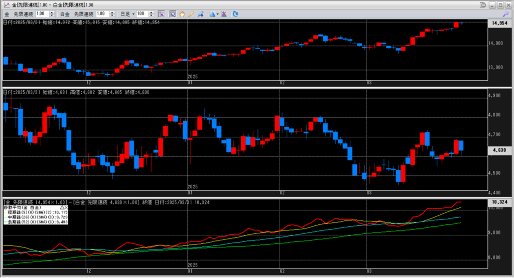 下記に金白金鞘の移動平均線のチャートを貼り付けています。