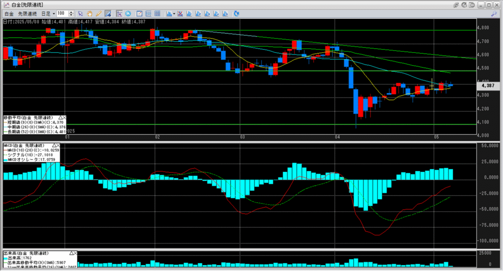 中期線を超えてきたことで、白金価格は上昇していくのか。