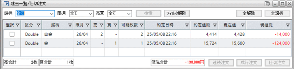 鞘拡大の仕掛け金買い1枚-白金売り2枚を1組、建てました。