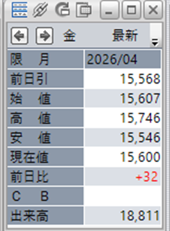 金価格は、6:00時点での終値は15,600円となっています。