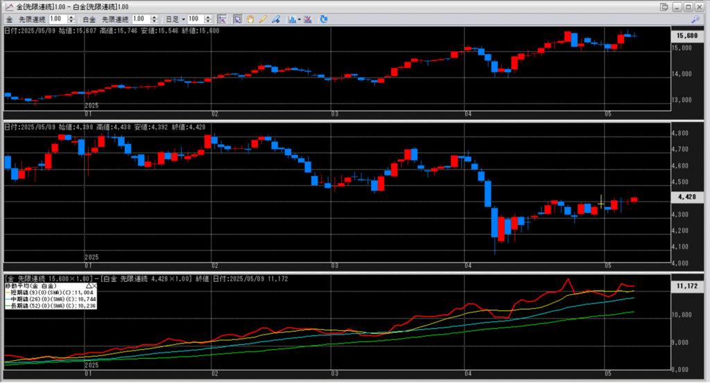 下記に金白金鞘の移動平均線のチャートを貼り付けています。