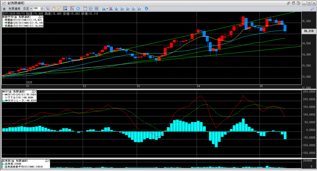 移動平均線の真ん中に位置している中期線15,180円を割り込んで、