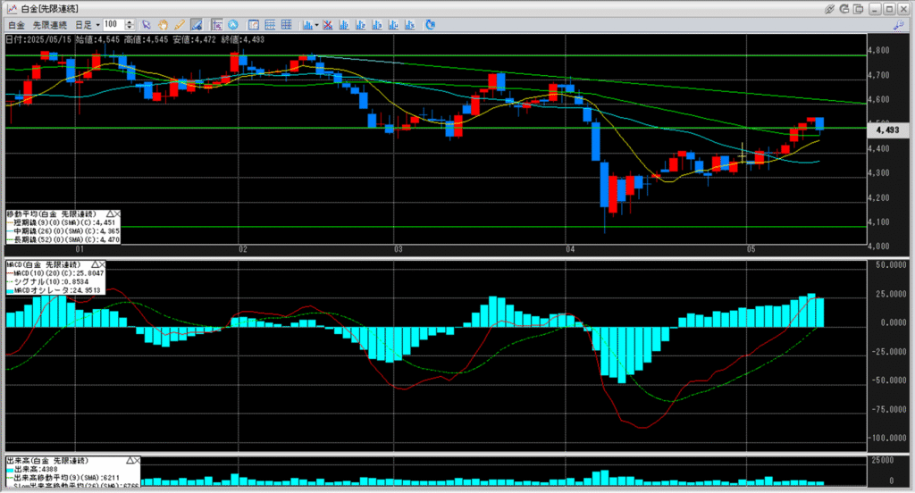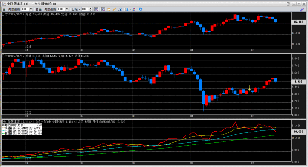 下記に金白金鞘の移動平均線のチャートを貼り付けています。