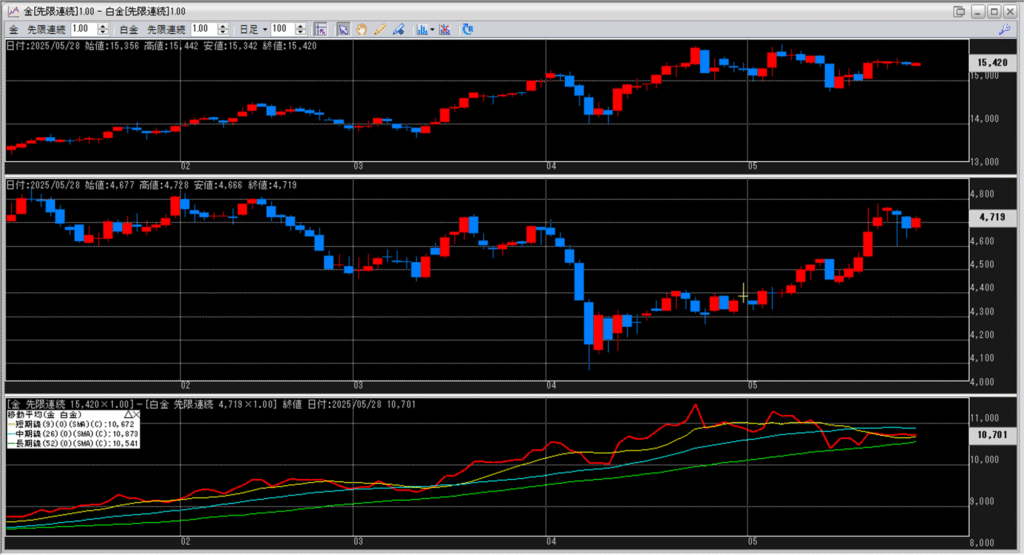 下記に金白金鞘の移動平均線のチャートを貼り付けています。