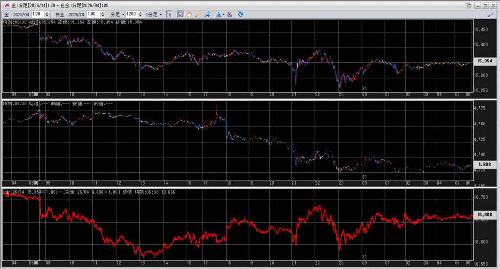 下:金白金鞘(金白金の価格差 = 金1グラムの価格 - 白金1グラムの価格)