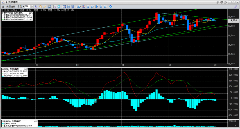 移動平均線の一番上に位置している短期線15,414円を割り込んで、