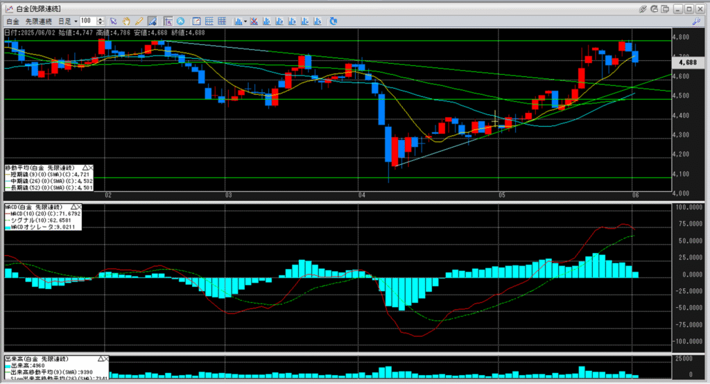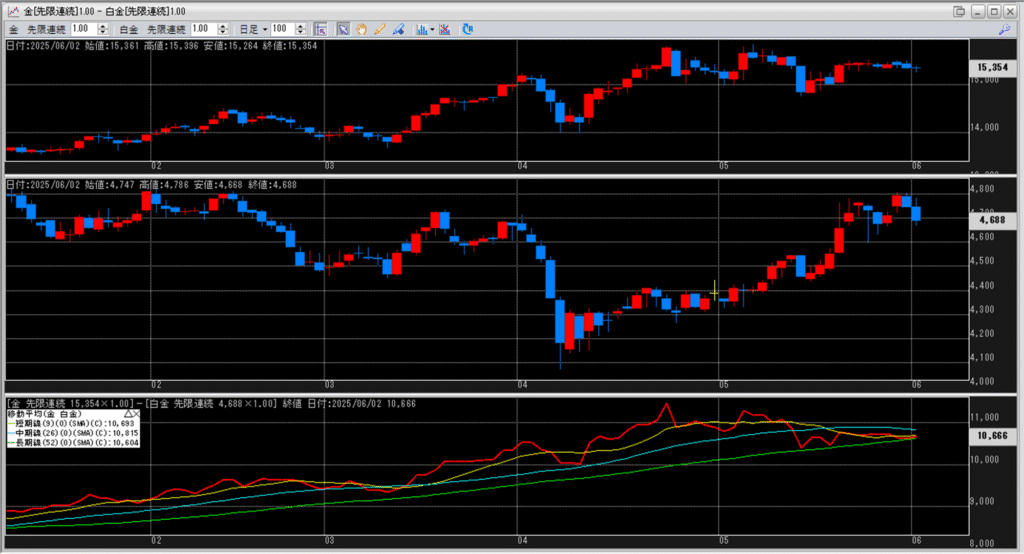 下記に金白金鞘の移動平均線のチャートを貼り付けています。
