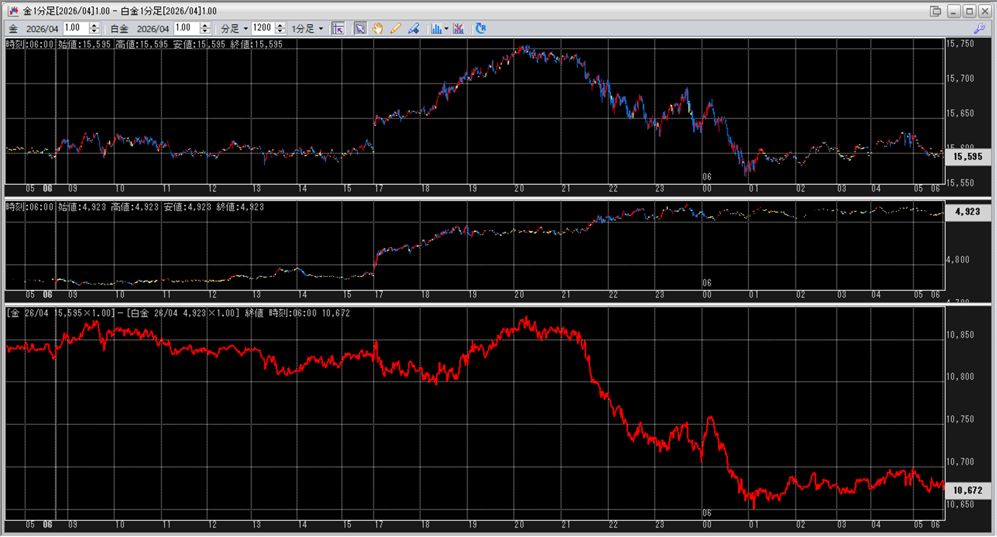 下:金白金鞘(金白金の価格差 = 金1グラムの価格 - 白金1グラムの価格)