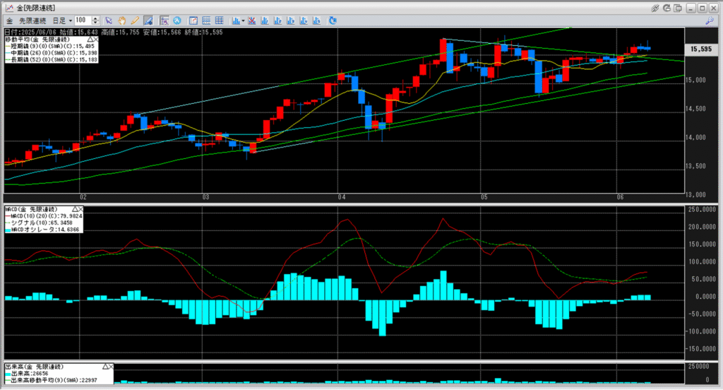 移動平均線の一番上に位置している短期線15,495円を越えて、
