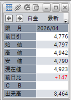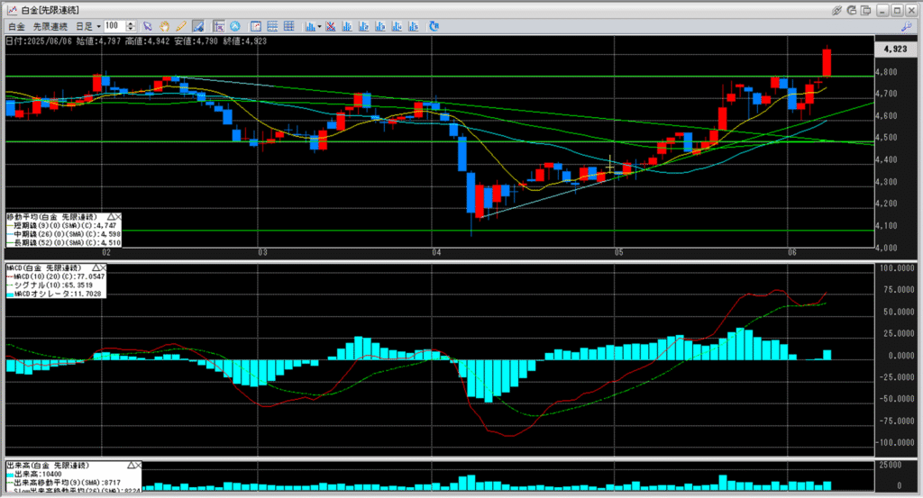白金単体では、抵抗線となっていた4,800円を超えてきており、