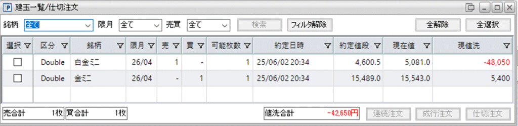 ミニで金白金鞘拡大の仕掛け金ミニ買い1枚-白金ミニ売り1枚を