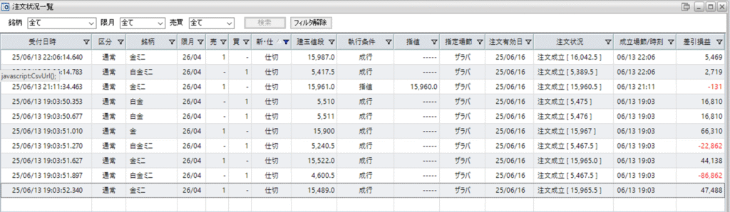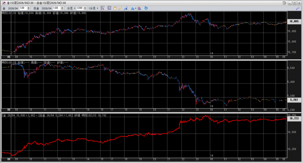 通常の金白金鞘拡大の仕掛け金買い1枚-白金売り2枚を建てたりしました。