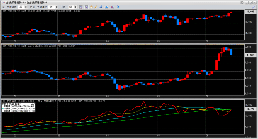 下記に金白金鞘の移動平均線のチャートを貼り付けています。