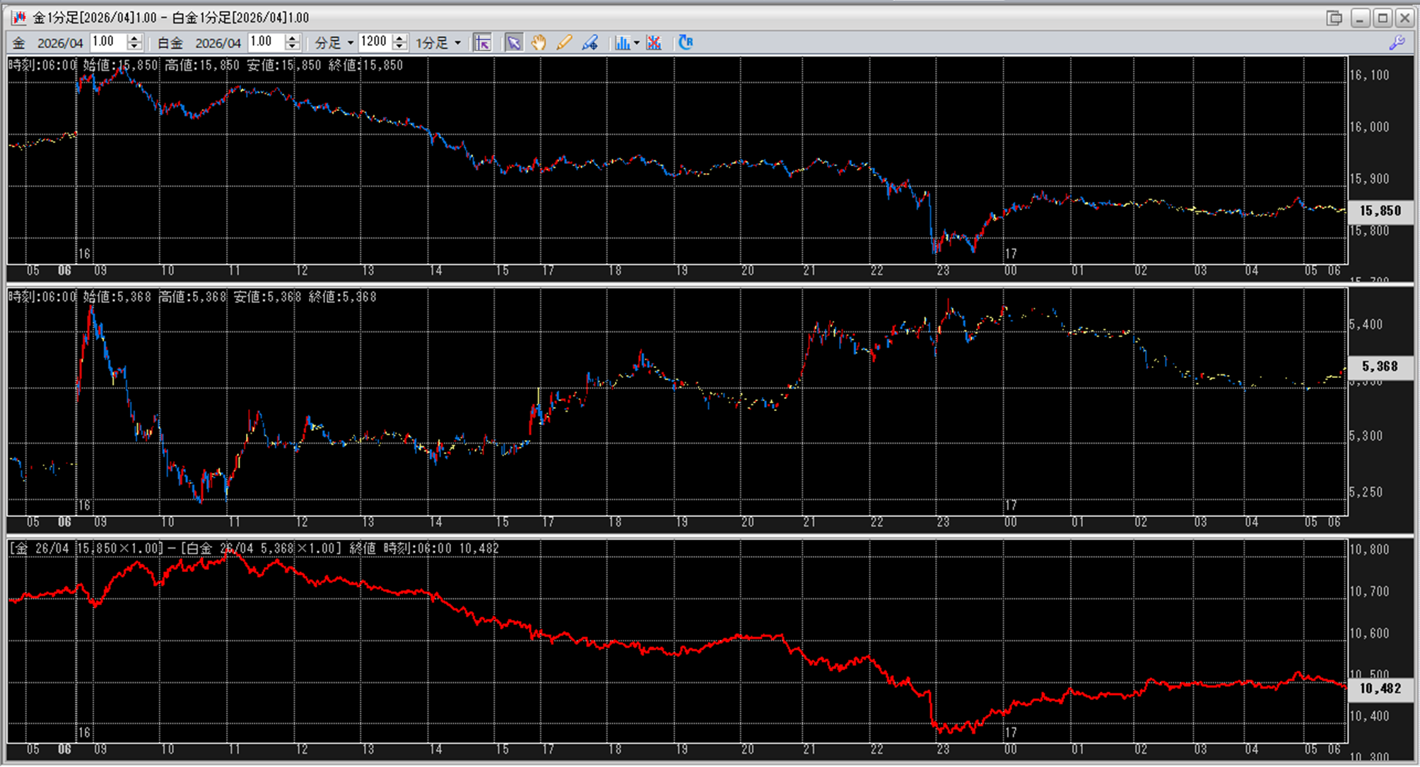 下:金白金鞘(金白金の価格差 = 金1グラムの価格 - 白金1グラムの価格)