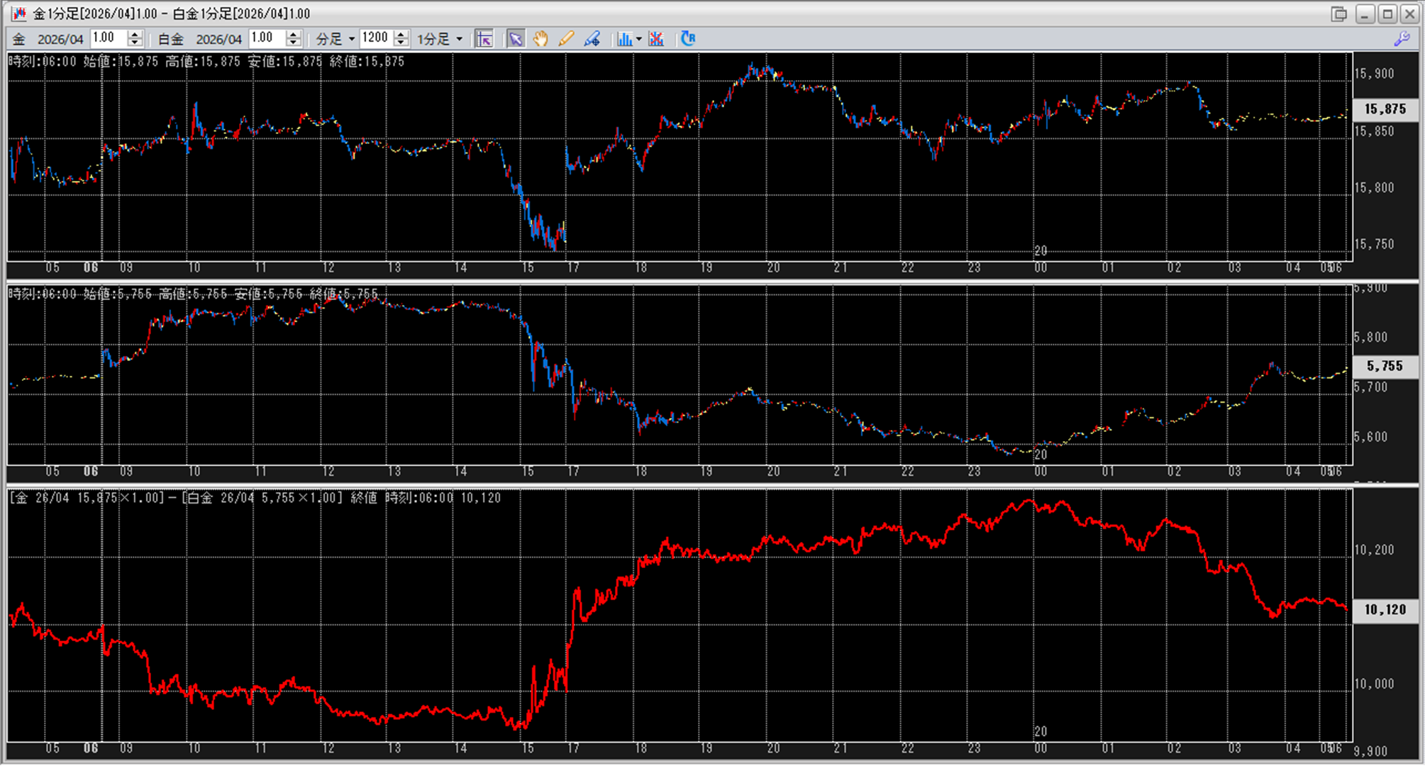 下:金白金鞘(金白金の価格差 = 金1グラムの価格 - 白金1グラムの価格)