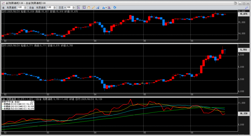 下記に金白金鞘の移動平均線のチャートを貼り付けています。