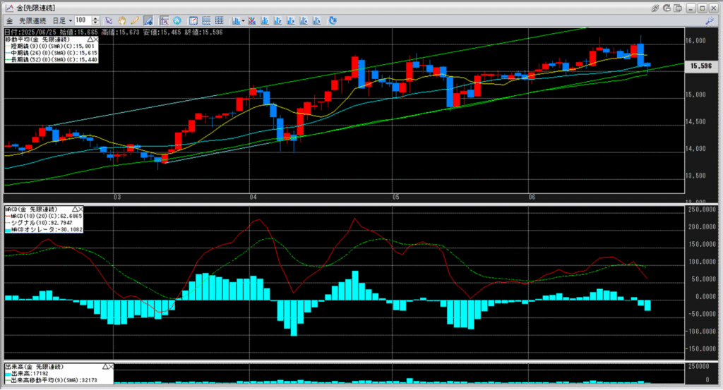 移動平均線の真ん中に位置している中期線15,615円を越えて、